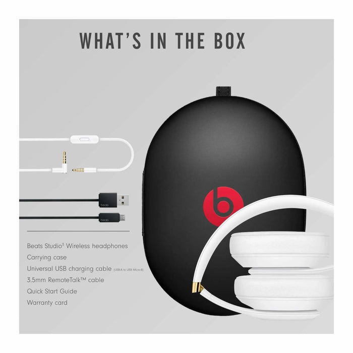What's in the box: Beats Studio3 Wireless headphones, Carrying case, 3.5mm RemoteTalk cable, Universal USB charging cable, Quick Start Guide, Warranty Card (USB power adapter sold separately)